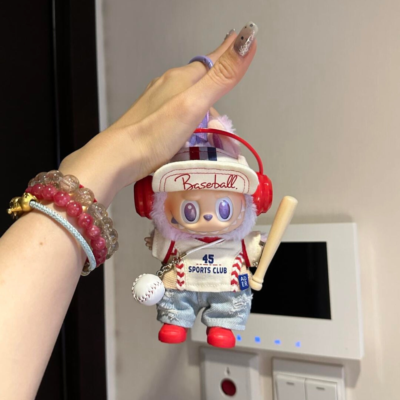 Seven-piece set includes: headphones + baseball cap + top + jeans + shoes + baseball crossbody bag + baseball bat